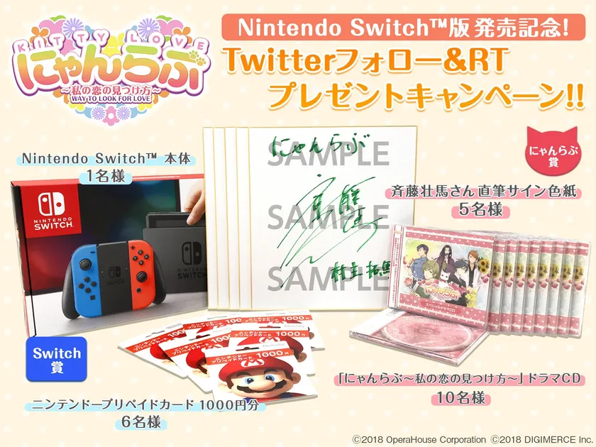 株式会社デジマース(本社:東京都品川区、代表取締役社長:石川 達絵)は、Nintendo Switch(TM)専用ソフトとして配信中の女性向け恋愛アドベンチャーゲーム『にゃんらぶ~私の恋の見つけ方~』の発売を記念し、2018年9月14日(金)から、豪華賞品が22(にゃんにゃん)名様に当たるプレゼントキャンペーンを開催いたします。