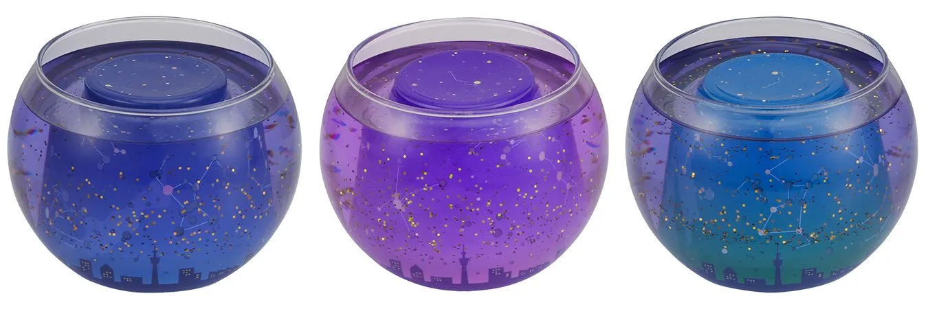 ラズベリーは冬の星空、シトラスは夏と秋の星空、アナナスは春と夏の星空と、香りごとにデザイン(※)と色を変更。LEDライトを点灯させると、星座を描いたデカールとジェルにちりばめられたラメが輝きます。