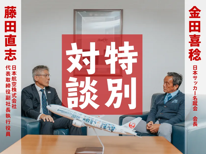 一般社団法人日本サッカー名蹴会(本社:東京都千代田区、代表理事:金田喜稔、以下 名蹴会)は、日本航空株式会社(本社:東京都品川区、代表取締役社長執行役員:赤坂祐二、以下 JAL)代表取締役副社長執行役員 藤田直志と名蹴会 会長・元サッカー日本代表 金田喜稔による対談を行い、2018年10月11日に、特別対談記事「藤田直志 × 金田喜稔 特別対談|スポーツ支援とスポーツの価値」を公式webサイト上に公開しました。