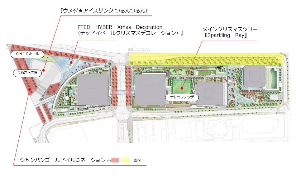 開催期間中、うめきた広場とナレッジプラザをはじめとした館内各所に「閃光」をモチーフとした、象徴的なクリスマスツリー、クリスマスオブジェ、ライトアップなどの装飾が施されます。また、例年ご好評をいただいている、うめきた広場をはじめとする施設外周の樹木を彩る『シャンパンゴールドイルミネーション』は、昨年に比べて約1.5倍に規模を拡大し、より華やかな輝きで皆さまをお迎えします。今年から追加された北館西側歩道部分(下図の黄色部分)には、約15万球のLED電球で装飾された60本以上の樹木が約300mにわたって続き、重なりあってきらめく光の粒が、ロマンチックな空間を演出します。