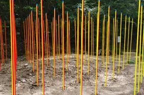 六甲山の自然と向かい合う作品として逆説的な表現に挑んだ作品です。自然界には存在しない塗り分けられた人工的な蛍光色、すらっとした100本ほどの角材は植林をイメージしています。六甲山の自然は明治時代初頭には禿山だった山稜を居留外国人初め多くの先人が木を植えて現在の姿に育てたものです。自然とは何かを考える契機となる作品です。