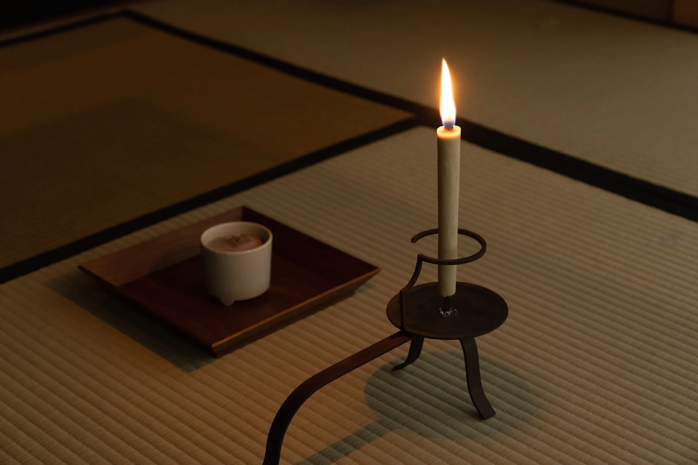 開催場所の和室をほのかに照らす和ろうそくは、1914年創業の和ろうそく専門店「大與(だいよ)」のものです。使用する和ろうそくは、天然素材であるハゼの実から搾取した蝋でできているため、西洋ろうそくとは異なり匂いがなく、繊細な香木の香りを邪魔しません。また、和ろうそくの芯は和紙とイグサを用いた灯心(とうしん)と呼ばれる太い芯です。この灯心はたっぷりと蝋を含んで燃焼することから、和ろうそくは西洋ろうそくに比べて、炎のゆらぎが不規則で美しいといわれます。さらに、炎が深いオレンジ色であることも和ろうそくの特徴です。そのため参加者は、冬の寒夜に、ゆらぐ暖かな灯りを楽しむことができます。