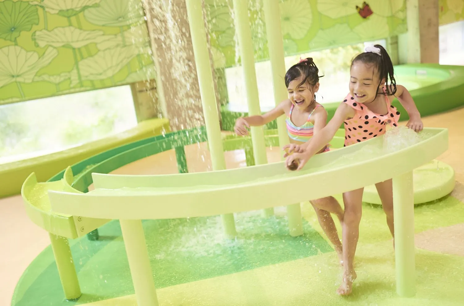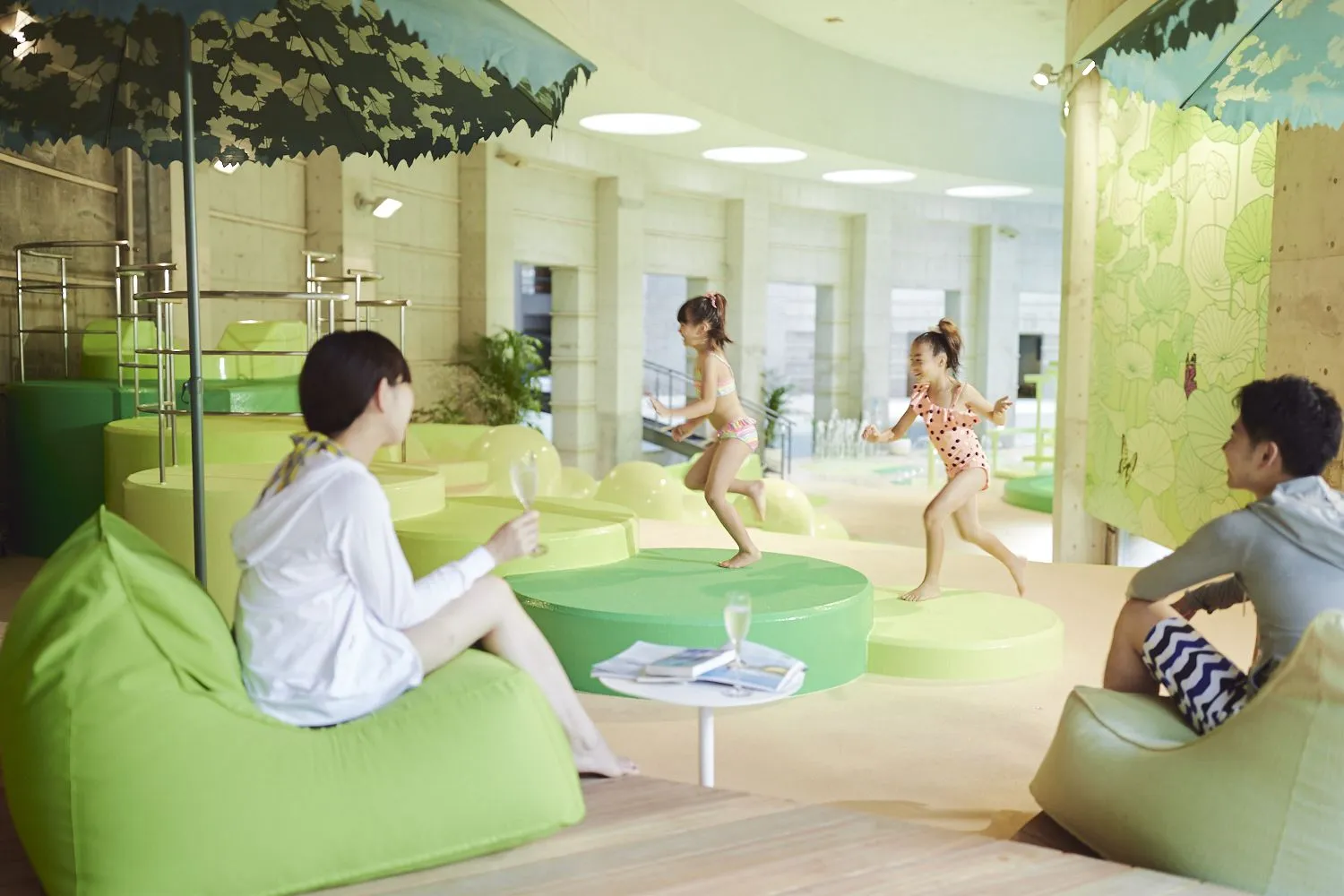 「森の中の海」がコンセプトのイルマーレに2018年夏、キッズエリアが誕生しました。ファミリーをメインターゲットに、0歳から小学校低学年の子どもが怖がらず自然に水と親しめるように、デザイン性のある遊具をバラエティー豊富に揃えました。壁には、カエルやテントウムシなど、生き物たちが暮らす森の世界を描き、まるで彼らの世界に訪れたような非日常の世界で、楽しく水遊びをすることができます。