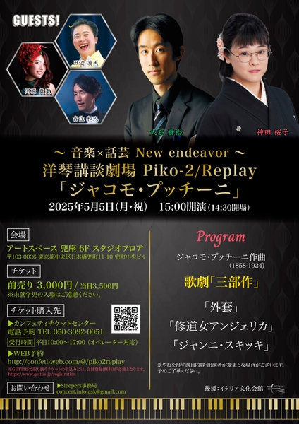 『洋琴講談劇場 Piko-2/Replay 「ジャコモ・プッチーニ」』が2025年5月5日 (月・祝)にアートスペース 兜座(東京都中央区日本橋兜町11-10 兜町中央ビル)にて上演されます。