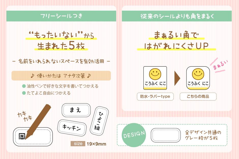 【新商品の特長】日常的に発生する名前つけがスムーズに。自由に文字が書けるフリーシールつき