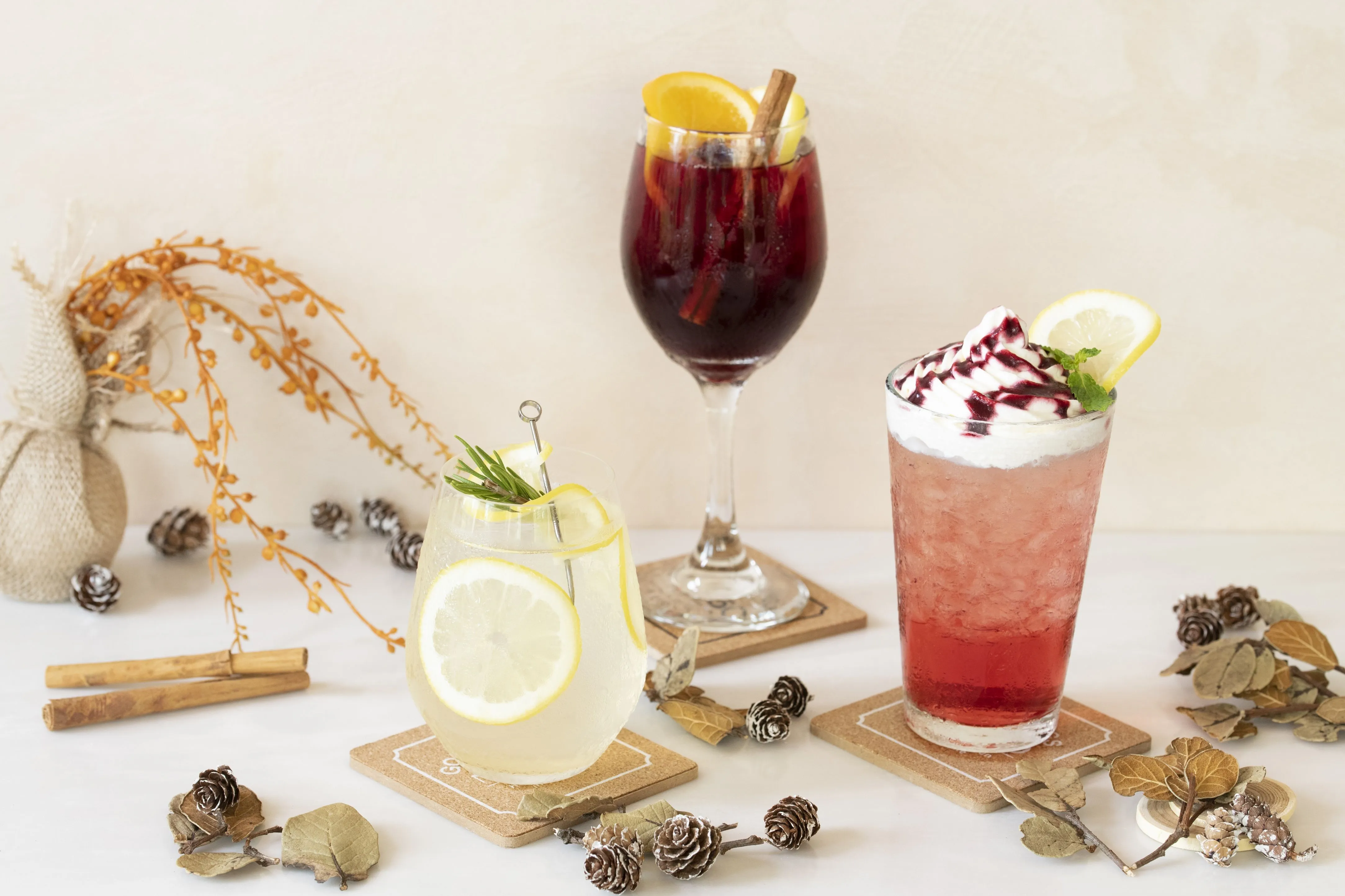 暑さ和らぐ秋限定のメニューは、爽やかで酸味の効いたオリジナルドリンク3種「ホワイトグレープレモンスカッシュ」「グレープクリームソーダ」、「オリジナルサングリア」をご用意しました。