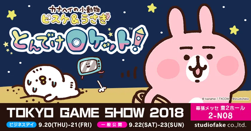 株式会社スタジオフェイク(本社:神奈川県川崎市、代表取締役:石本則子、岡安啓司)は、株式会社テレビ東京コミュニケーションズ(本社:東京都港区、代表取締役社長:大島信彦)が広告・商品化・映像化の独占窓口を務めるキャラクター、カナヘイの小動物「ピスケ&うさぎ」のiOS/Android(TM)端末向け最新パズルゲーム『カナヘイの小動物 ピスケ&うさぎ とんでけロケット!(TM)』を2018年秋に配信いたします。