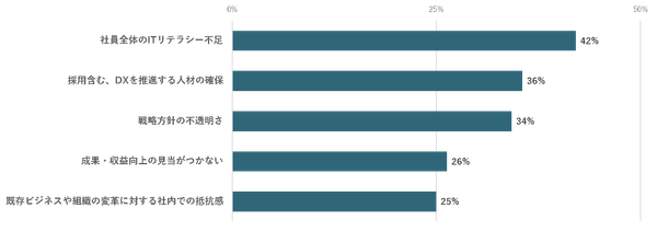 - DX推進の障壁は「社員全体のITリテラシー不足」と回答した社が42%