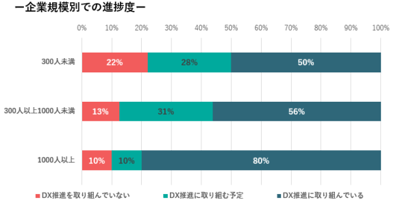 回答いただいた媒体社のうち、DXに「取り組んでいる」と回答した企業は55%、「取り組む予定」まで含めると81%となりました。企業規模別で比較すると、DXに取り組む媒体社は、従業員数1000人以上では8割にのぼる一方で、1000人未満の場合は約5割にとどまっており、企業規模によってDX推進の進捗度に大きな開きが生じていることが分かりました。