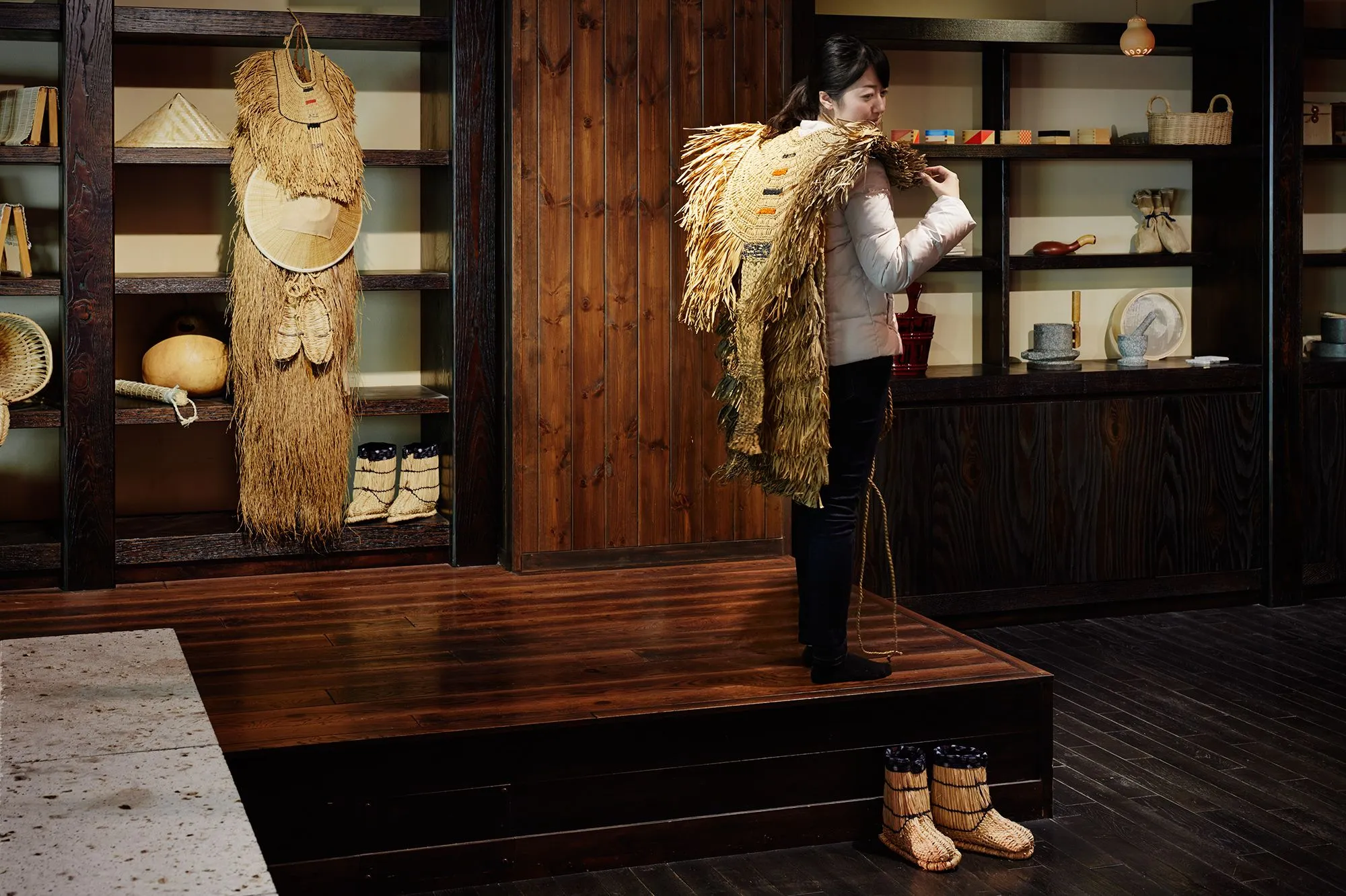 この送迎バス利用のお客様限定で、里山で昔から使われてきた蓑(みの)や藁靴(わらぐつ)を着用することができます。蓑は藁を編んで作られた雨具の一種で、雨や雪を防ぐ為に衣裳の上からまとうものです。この蓑と、雪深い場所で使われる藁で編んだ藁靴は、冬の厳しい寒さをしのぐ里山の知恵として欠かせない物、と言われてました。界川治では、この里山の知恵を体験できます。