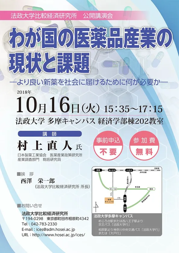 法政大学、国内医薬品産業界の現状と課題についての 公開講演会を多摩キャンパスで10月16日(火)に開催