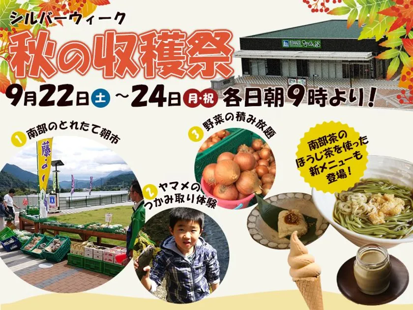 株式会社TTC(所在地:静岡県熱海市、代表取締役:河越康行)が運営する、オープンから1か月で15万人を突破した道の駅なんぶは、9月22日(土)~24日(月・祝)の3日間、「秋の収穫祭」と題してとれたて素材を楽しめる朝市や、ヤマメのつかみ取りなど秋の味覚を堪能できる特別企画を多数開催します。