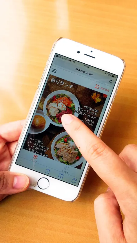 テーブル上のQRコードを、スマートフォンで読み込むと表示されるデジタルメニューブックから、ご注文とお会計を簡単に行うことができます。