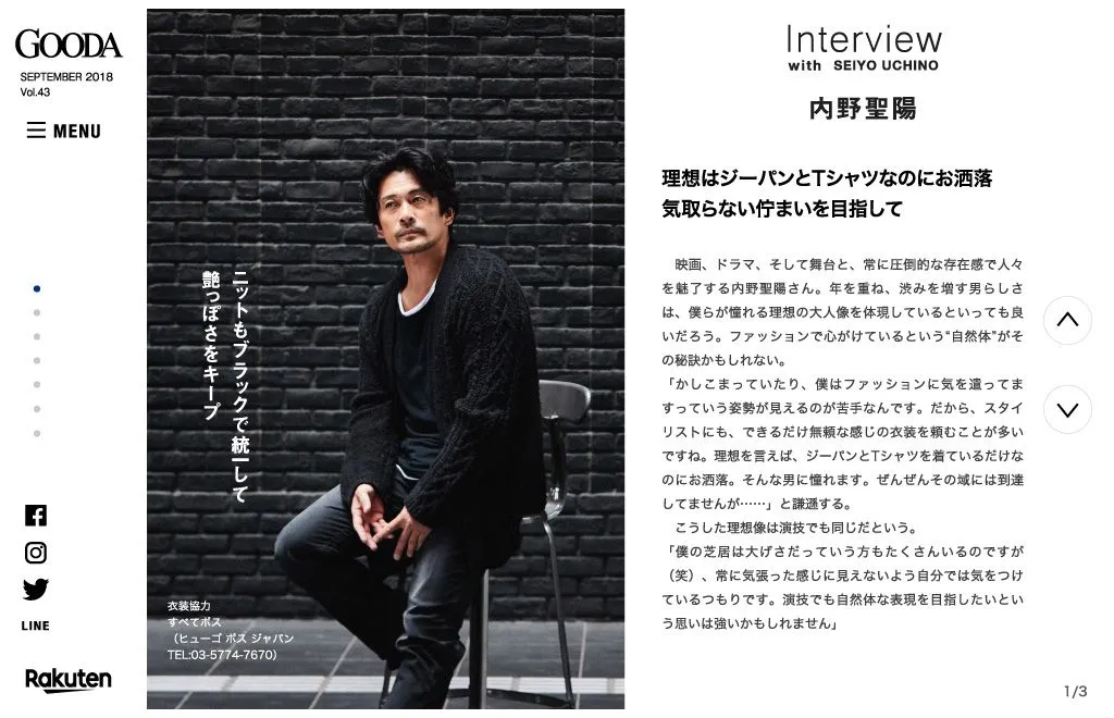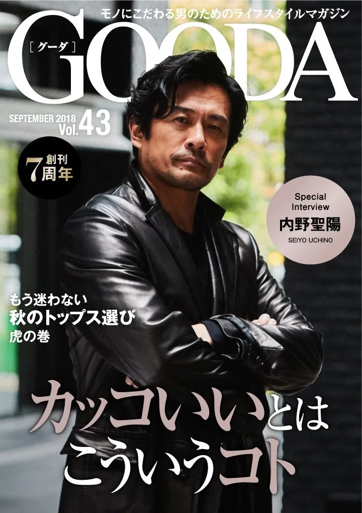 創刊7年目を迎えたGOODA。表紙・巻頭グラビアには、俳優の内野聖陽さんが登場。素材にこだわった、男っぽさ全開の秋のコーディネートを着こなします。特集は暑さと寒さの、ちょうど真ん中の今の時期に重宝する、1枚プラスオンで洒落っ気が出せるトップスの着こなしテクをご紹介。