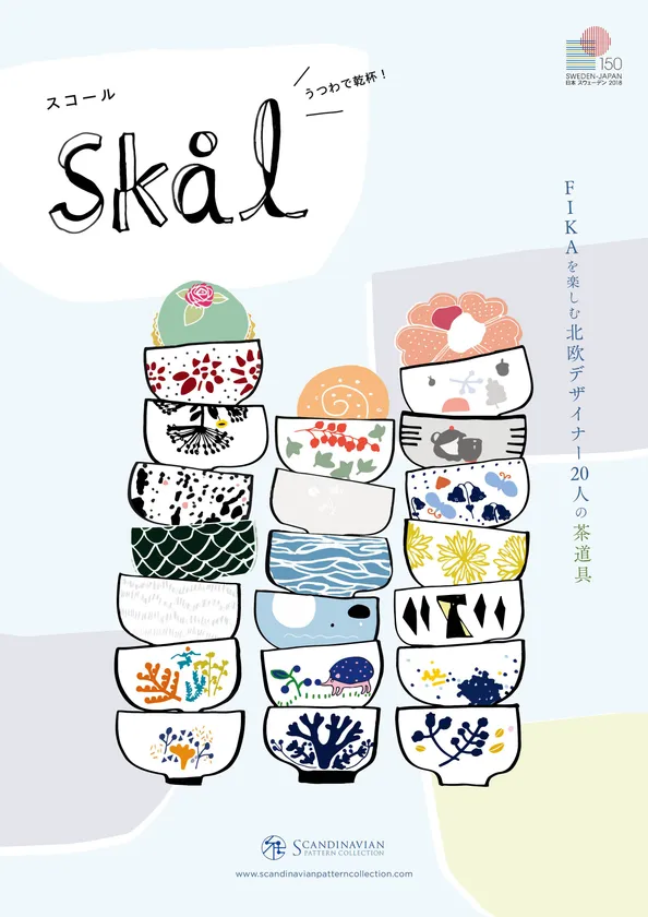 そのようななかで、今回の展覧会では、茶の湯で使われる茶道具に着目し、Scandinavian Pattern Collection所属のデザイナーが、それぞれの気持ちをこめて、抹茶茶碗、懐紙、扇子のコーディネートをデザインしました。タイトルとして使用されているSKAL(スコール)という言葉は、スウェーデン語で(1)器、(2)乾杯!という二つの意味を持ち、150周年の祝杯にはぴったりの言葉です。
