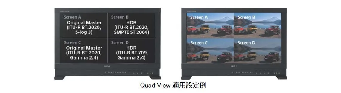 また、55 型業務用4K 有機EL モニター『PVM-X550』同様、「Quad View モード」を搭載。モニターを4 分割表示し、各映像に合わせた設定値(EOTF※3、ユーザーLUT、色域、伝送マトリクス、色温度など)を分割画面ごとに適用することが可能です。SDR とHDR の各映像を同じ画面内で比較できます。