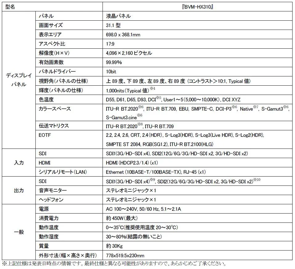 ソニーは、新開発の4K (4096×2160 ピクセル)液晶パネルを用いた31 型のHDR 対応マスターモニター『BVM-HX310』を発売します。