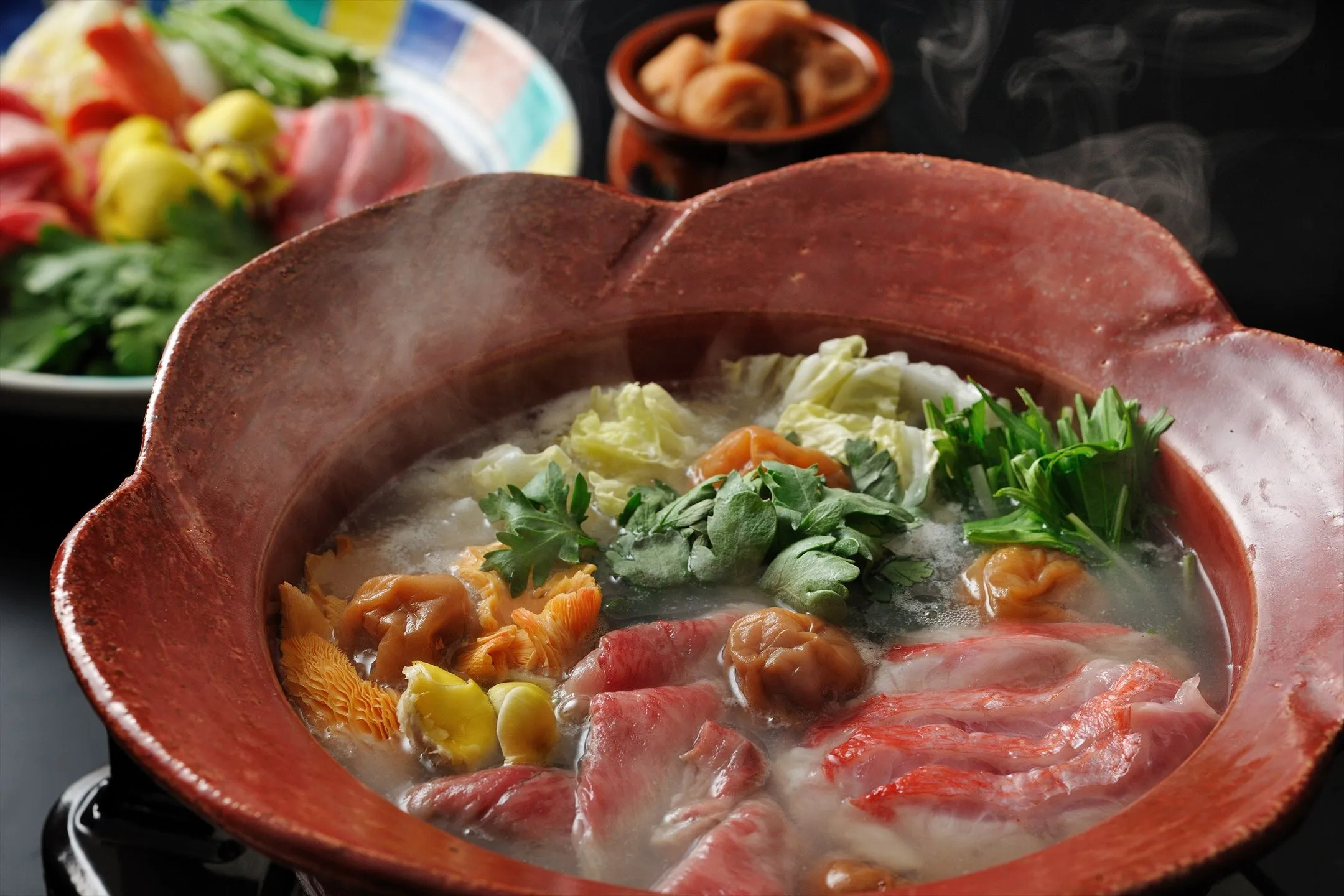 界熱海では、古来より熱海で愛されてきた梅にちなみ、梅干しをたっぷりと浮かべた梅鍋を提供します。鍋に入った梅干しの梅肉と、牛肉や季節の野菜を合わせて食べる、さっぱりした味わいが特徴です。梅の花の形をした鍋は特注品です。