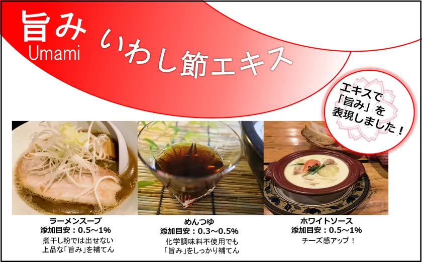 今回は「イノシン酸」含有量の多い“いわし節”に着目し、エキス化を目指しました。今までのいわし節エキス(煮干しエキス)は香りが強く、旨み補てんとしては使いにくいことも…。そこで、独自の製法で魚の臭みを抑えつつ、旨みを最大限に引き出した“旨みいわし節エキス”を開発しました。化学調味料等不使用でも、旨みをしっかり補てんすることができます。