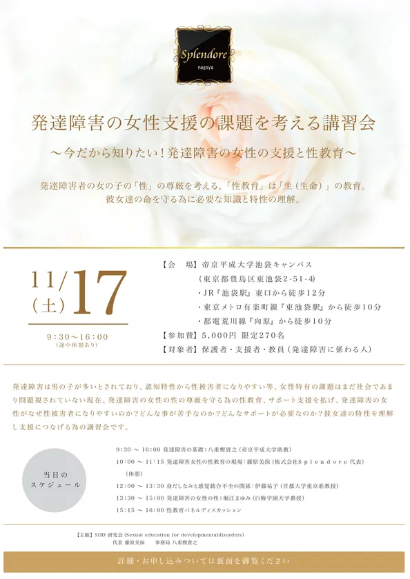 株式会社Splendore(本社:愛知県名古屋市、代表取締役:藤原 美保)が運営を行っている「SDD(Sexual education for developmental disorders)研究会」(代表:藤原 美保、事務局:八重樫 貴之)は、イベント「発達障害の女性支援の課題を考える講習会~今だから知りたい!発達障害の女性の支援と性教育~」を2018年11月17日(土)、東京・帝京平成大学 池袋キャンバス605号室にて開催致します。