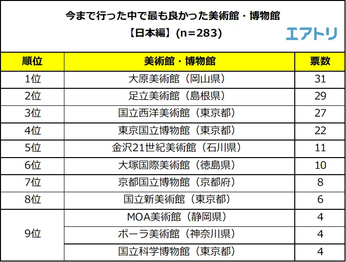 美術館・博物館を目的とした旅行に行った事がある人に対し、今までで最も良かった美術館・博物館を聞いたところ、国内の1位は岡山県の「大原美術館」となりました。2位以下には「足立美術館」「国立西洋美術館」などが続き、東京都の美術館・博物館が多く選ばれました。