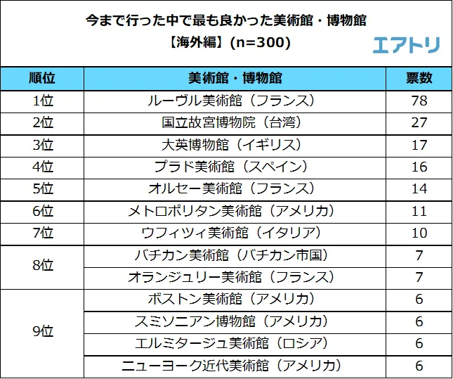 海外では、フランスの「ルーヴル美術館」が1位となり、2位の約3倍もの票を集めるほどの人気となりました。2位には台湾の「国立故宮博物院」、3位にはイギリスの「大英博物館」が選ばれました。