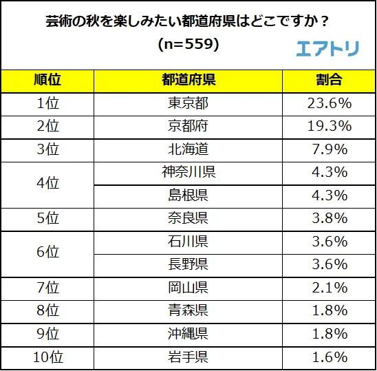 芸術の秋を楽しみたい都道府県・国はどこか聞いたところ、国内では「東京都(23.6%)」が最も芸術の秋を楽しみたい都道府県として選ばれました。今まで行った中で最も良かった美術館・博物館でも東京都の美術館・博物館が多く選ばれている事からも、最も芸術を楽しめる都道府県と言えるのかもしれません。
