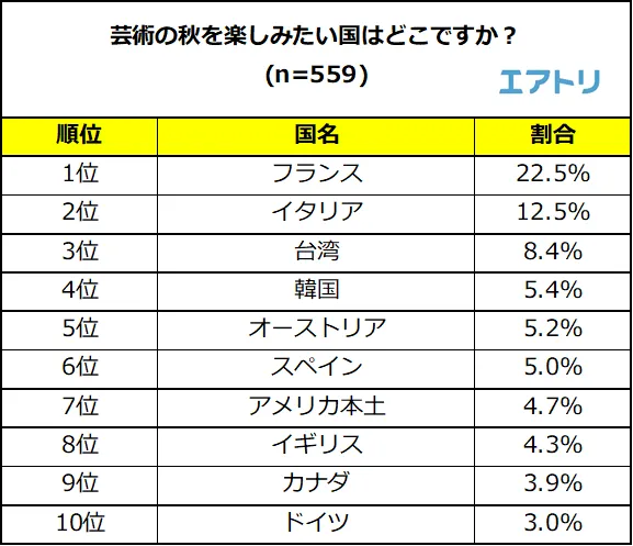 芸術の秋を楽しみたい国では「フランス(22.5%)」が1位に選ばれました。最も良かった美術館・博物館を聞いた問いでは、圧倒的な票数を集めた「ルーヴル美術館」をはじめ、「オルセー美術館」や「オランジュリー美術館」など有名な美術館を数多く有しているだけでなく、凱旋門やエッフェル塔など街の中でも楽しむことが出来る点も芸術の秋を楽しみたい国として選ばれた要因の一つかもしれません。