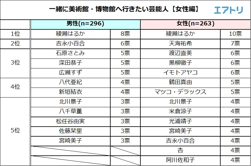 調査5:一緒に美術館・博物館に行きたい【女性芸能人】を教えてください。