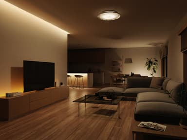 このシーリング照明で主照明として部屋を照らすことができるので、1台で部屋全体の照明演出を行うことができます。また、マンションや賃貸などすでに天井に引掛シーリングが設置されている場合、電気工事なしで手軽に設置ができます。また、これまでフィリップス ライティング社から発売されているHueライトリボンやHue Go、弊社Hue対応製品などと組み合わせることで、例えばリビングで家族だんらんの時にはシーリングで全般的に部屋を明るくするなど日常のあかりから、映画や音楽を楽しむ時などには間接照明やカラーライティングで映像や音楽とシンクロさせるなど多彩な演出が可能です。