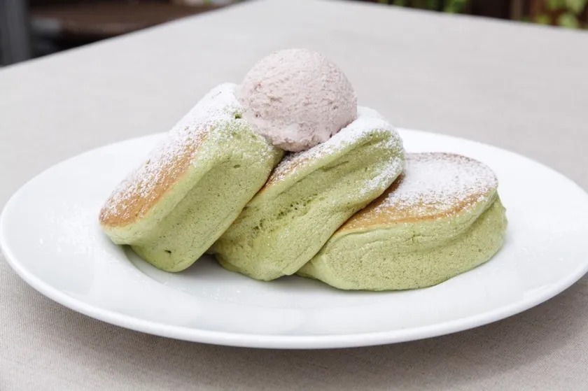 抹茶の香りが濃厚なふわふわのパンケーキ。丁寧に焼き上げられ、ほんのり抹茶色に染まったパンケーキの上にはしっとりとした小倉バターが乗っています。和のテイストをたっぷりご堪能頂けるメニューです。