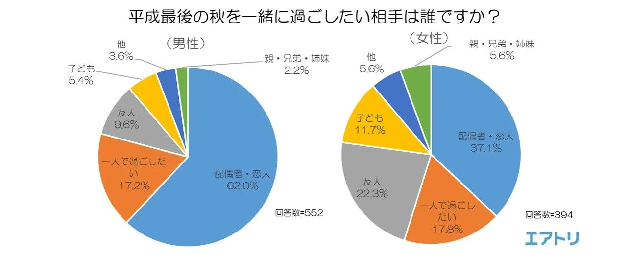エアトリでは全国946人を対象に、「平成最後の秋に誰とどのように過ごしたいか」について、アンケート調査を行いました。