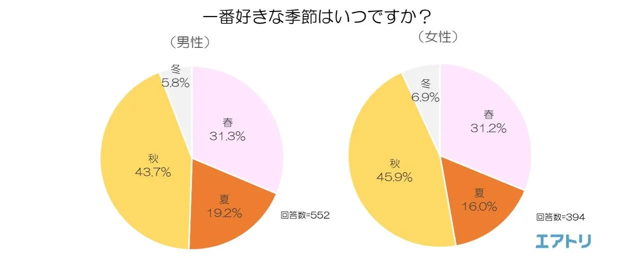1番好きな季節はいつですか?の問いには、「秋」と回答した人が(男性:43.7% 女性:45.9%)となり、男女共に最も高い割合でした。2位以下は、2位「春」(男性:31.3% 女性:31.2%)、3位「夏」(男性:19.2% 女性:16.0%)、4位「冬」(男性:5.8% 女性:6.9%)となりました。「夏」と回答した人が、前回2016年10月の調査(※)に対し、(男性:29.9%⇒19.2% 女性:18.1%⇒16.0%)と減少しており、今夏の猛暑による影響がうかがえます。