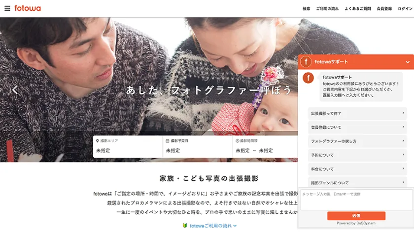 ピクスタ株式会社(東京都渋谷区、代表取締役社長:古俣 大介、東証マザーズ:3416)が運営する出張撮影プラットフォーム「fotowa(フォトワ)」( https://fotowa.com/ )では、営業時間外のお問い合わせにも迅速に対応することで、メインユーザーであるママユーザーの出張撮影に対する不安感を払拭することを目的に、2018年9月20日よりカスタマーサポートとして「チャットbot」を導入いたします。これにより、育児や家事等の理由でWebサイト上のFAQを熟読する余裕がなくてもサービス利用にあたっての懸念点や不明点が解消でき、より安心してfotowaを利用できるようになります。