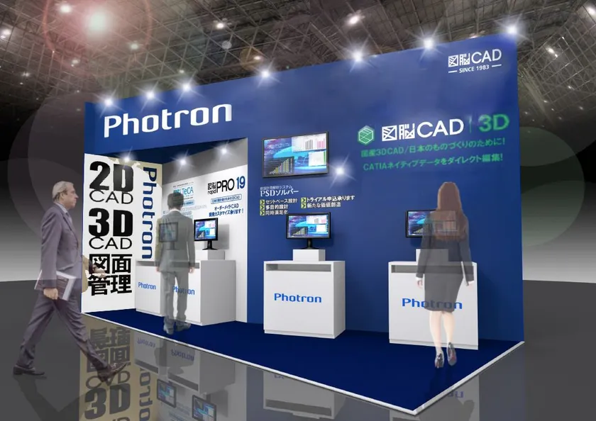 フォトロンブースではCATIAデータをそのまま編集できる新製品の3DCAD『図脳CAD3D』をはじめ、設計支援ツール『PSDソルバー』、製造業向け図面管理システム『図脳TeCA(ティーカ)』、2DCADの最新バージョン『図脳RAPIDPRO19』、動画編集アプリ『Photron-Mobile Video Creator』を出展いたします。