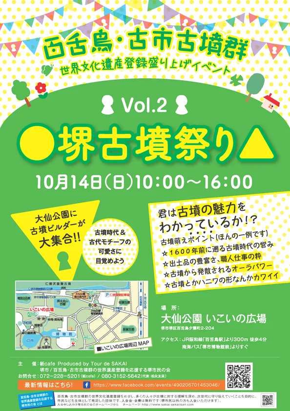 紙cafe produced by TOUR DE SAKAIと堺市/百舌鳥・古市古墳群の世界遺産登録を応援する堺市民の会は、大阪初のユネスコ世界文化遺産登録をめざす「百舌鳥・古市古墳群(もずふるいちこふんぐん)」盛り上げイベント『●堺古墳祭り▲ Vol.2』を2018年10月14(日)に「大仙公園 いこいの広場」で開催します。商店街に3,000人以上を集めた人気イベントがふたたび!