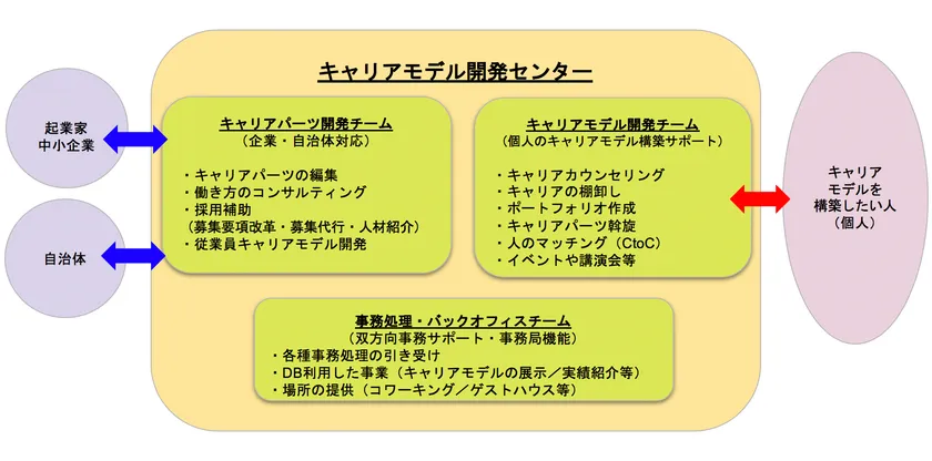 「キャリアモデル開発センター」は、自己実現意欲や貢献意欲を持ちつつも、自分自身のキャリア構築を模索している潜在起業層や首都圏の潜在UIJターン層に対し、現キャリアの棚卸し・言語化・キャリアモデルの可視化など、理想のキャリアモデルを構築するための様々な伴走サポートを提供します。また、受け入れ側の仙台・東北の起業家・企業・組織に対しては、案件の外部への切出しや、プロジェクトの組成を行いやすくするためのコンサルティングやサポートを提供し、人材の継続的な確保の実現を目指します。