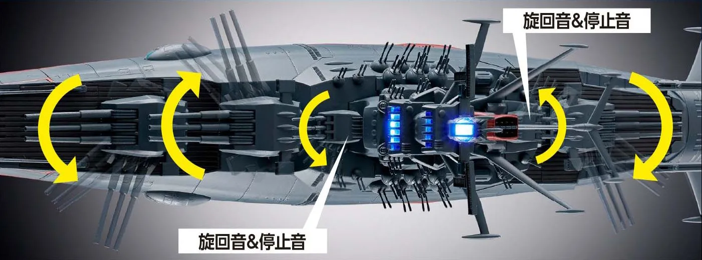 リモコン操作により、商品に搭載した音声をリアルタイムに合成して再生する技術です。内蔵された2基のモーターにより主砲3基・副砲2基の砲塔がリモコン操作で電動旋回。旋回に連動して、「旋回音」「旋回停止音」が動きに合わせて商品本体から鳴ります。