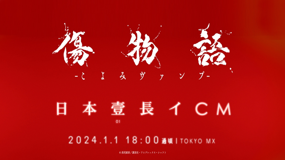 1月12日 全国劇場ロードショー『傷物語 -こよみヴァンプ-』 2024年元日、地上波にて日本史上最長 “日本壹長イ”8分間TVCMが放送決定! 18:00過頃TOKYO MXで、なんと480秒で1回のみ放送!