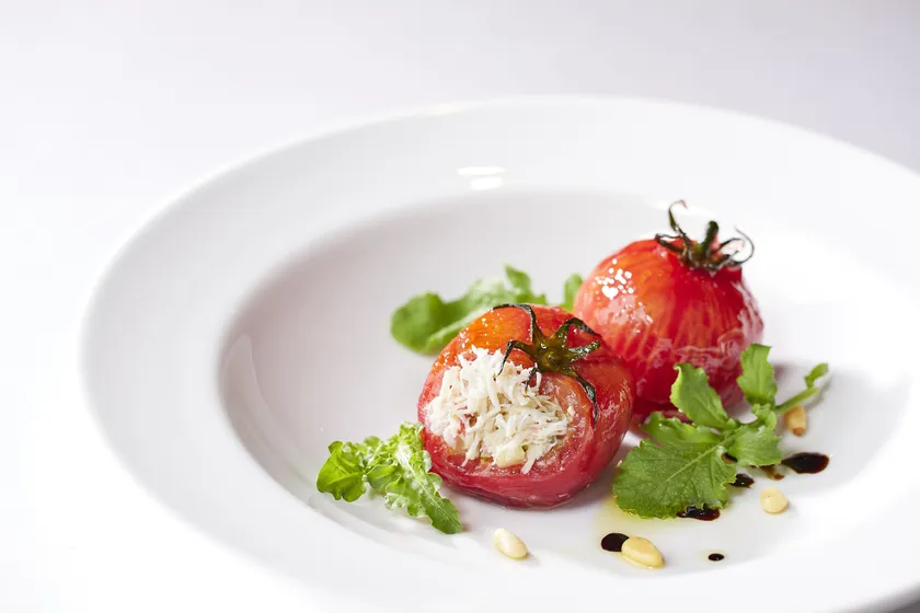 りんご飴に見立てたトマトの前菜。甘みの強いフルーツトマトに、カニ・アボカドを贅沢に詰めたフォションパリオリジナルのスペシャリテです