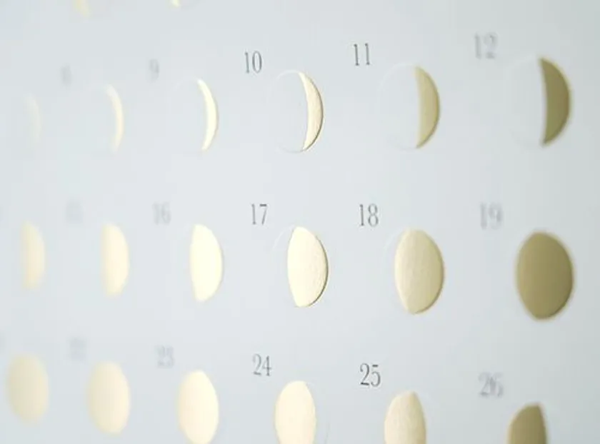 “月の満ち欠け”をモチーフにした大人向けカレンダー登場! 白紙に金の箔押しで光沢感や高級感を演出したシンプルなデザイン