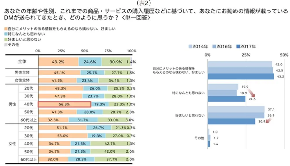 また、ターゲットの年齢や性別、商品・サービスの購入履歴などに基づいて個々人に最適化されたパーソナライズ(バリアブル)DMは、「自分にメリットのある情報をもらえるなら構わない、好ましい」と思う人は全体で43.2%おり、特に男性40代では56.3%と最も許容度が高いことが分かりました。女性20~30代でも過半数が好意的に捉えています。