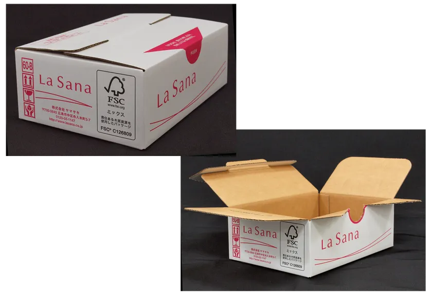 段ボールにはFSC森林認証材(※2)を使用し環境に配慮。またカット面を波型処理し怪我のリスクを軽減。更にOPPテープを排除し、差し込みフラップと送り状ラベルで封かんし、作業時間も削減。開封性向上と箱強度維持のため2種類のミシン目を使い分け、追加。お客様が手にした瞬間にブランドへの信頼や安心感を創ることを目的に開発しました。運用は2017年8月から開始しています。