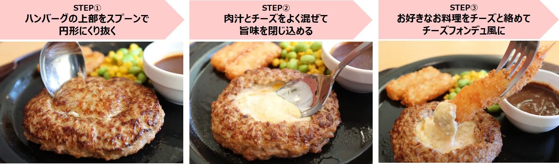 チーズINハンバーグが399円となるお得な期間中に、「フォンデュ食べ」をぜひお試しいただき、あなたのベストフォンデュを探していただければと思います。