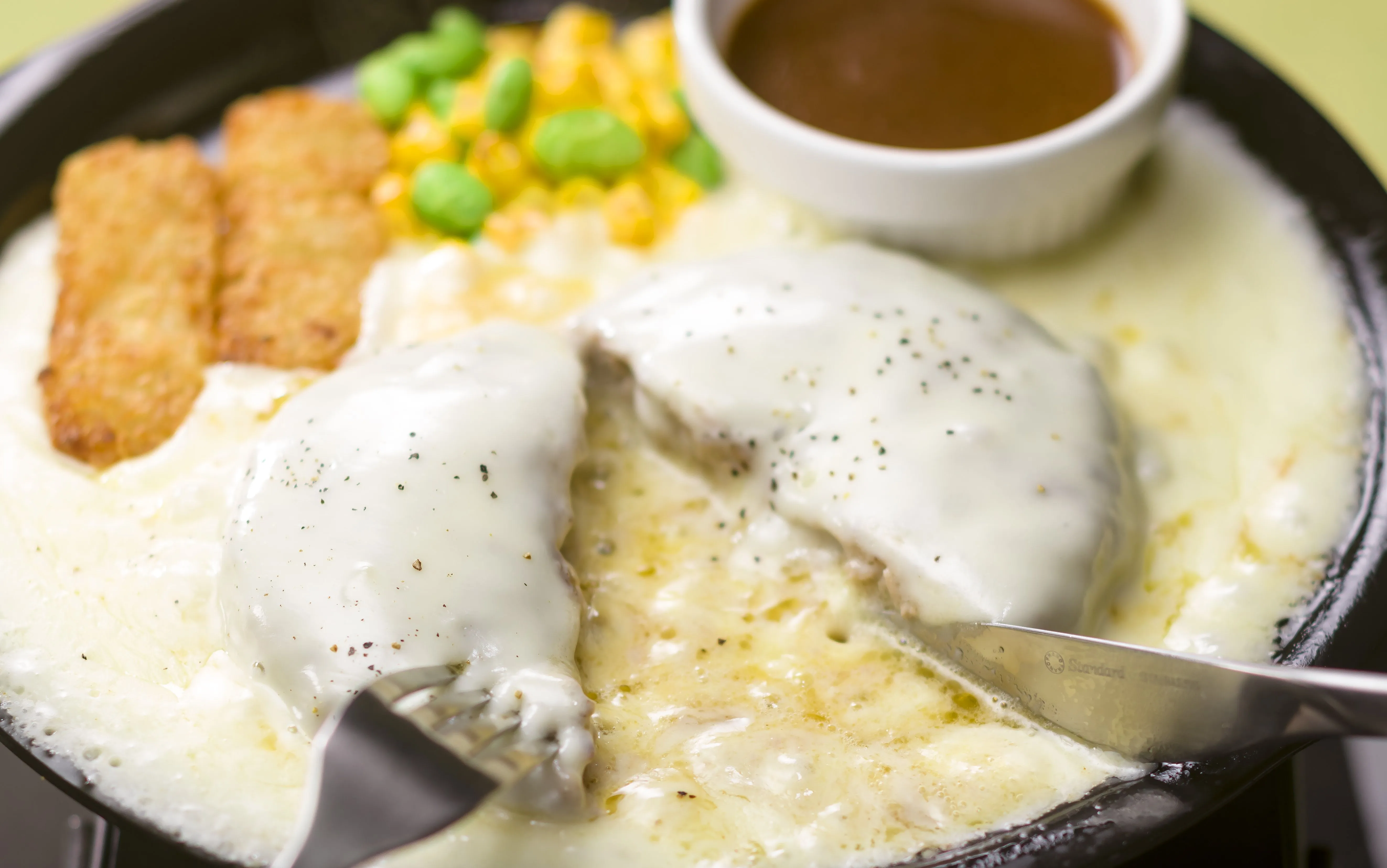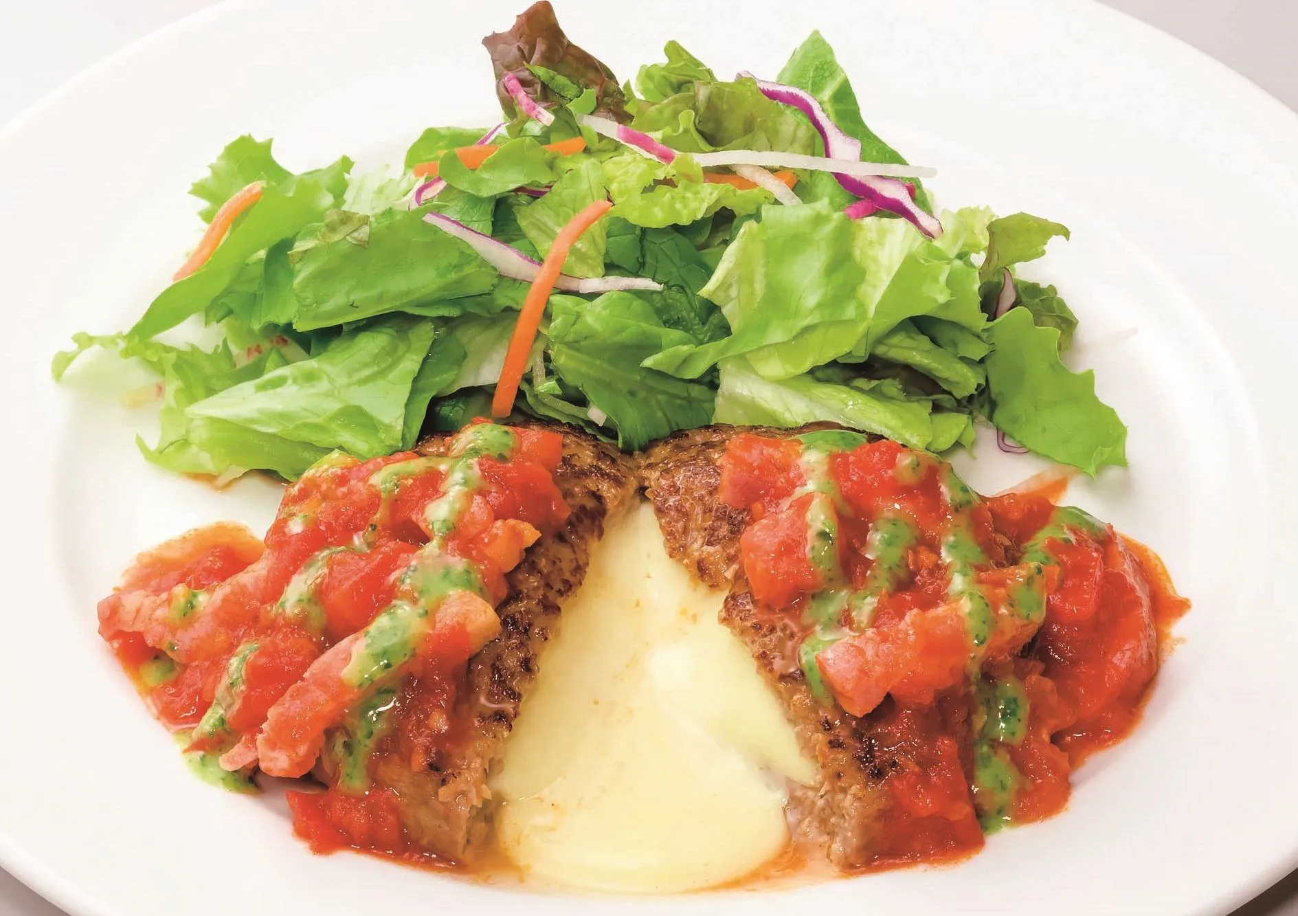 チーズINハンバーグの上部を円形にスプーンでくり抜き、肉汁と絡んだ濃厚なチーズと付け合せのポテトや野菜、サイドディッシュなどを絡める食べ方です。チーズのまろやかで贅沢な味わいをよりお楽しみいただけます。