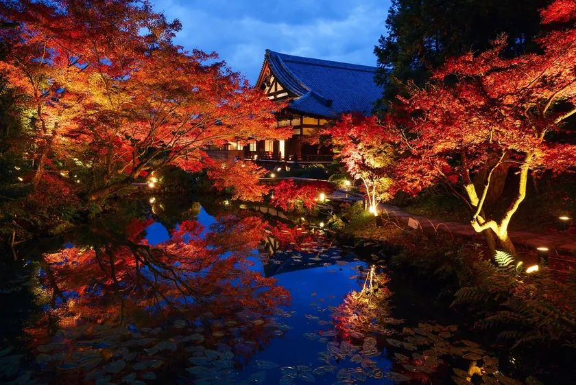 「虎の間」は襖を開閉すると虎の数が変わります。境内からは本陣らしく京都市内の夜景が一望でき、「紫雲の庭」の水面に映るライトアップされた紅葉は必見です。