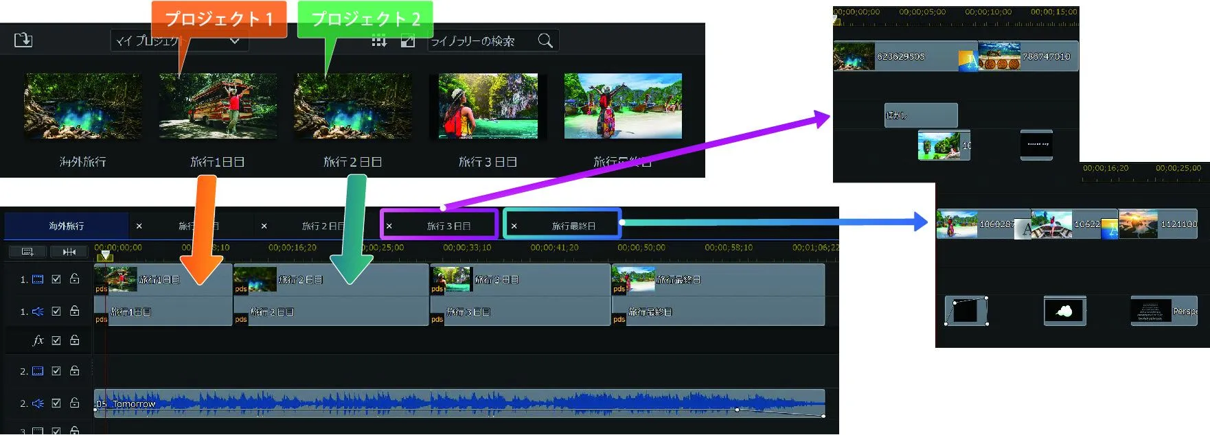 ・プロジェクトを組み合わせて、編集をすすめることができます。