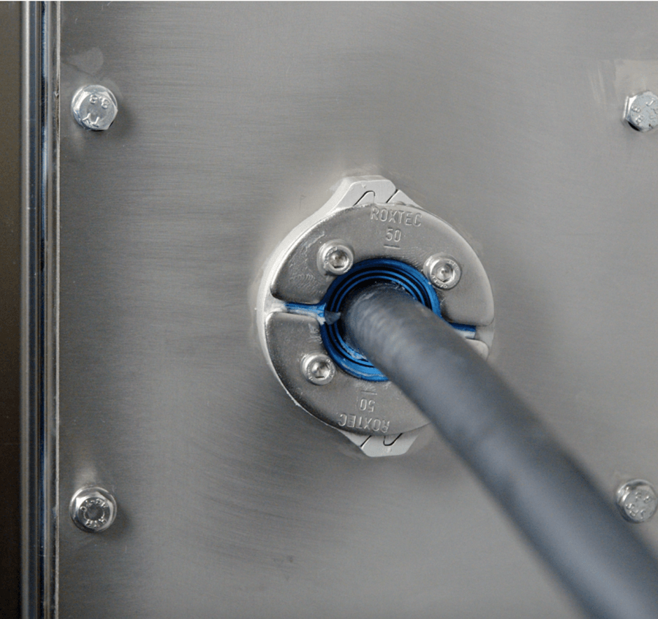 丸型シール Roxtec C RS SLO は、制御箱、エンクロージャー、機器筐体を貫通するケーブルやパイプに最適です。 高い適応性を持つ Roxtec C RS シールと Roxtec C SLO スリーブで構成されており、軽量化に役立ちます。 シールは分解できるタイプで片側からのアクセスで取り付けできます。端末処理済みのケーブルをそのまま通すことも可能です。