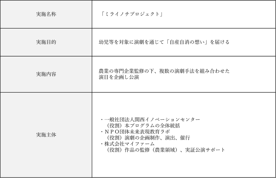 一般社団法人関西イノベーションセンター(代表理事:早乙女(そうとめ) 実(みのる)、以下当社団)と、株式会社マイファーム(代表取締役:西辻(にしつじ) 一真(かずま)、以下マイファーム)、NPO団体未来表現教育ラボ(代表:大野(おおの) たかよし、以下Mラボ)の3社は共同で、複数の演劇手法を融合させ「自産自消※の想い」を届ける、『ミライノチプロジェクト』を始動いたします。