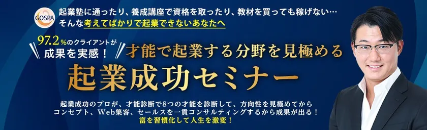 起業セミナー・目標達成コンサルティングを行う、株式会社GOSPA(所在地:大阪府大阪市、代表:滝内 恭敬)は、全く新しい起業セミナーを開発し、『考えてばかりで起業できない人が、才能で起業する分野を見極める「起業セミナー」』を東京・大阪・名古屋・福岡の全国主要都市で開催しています。